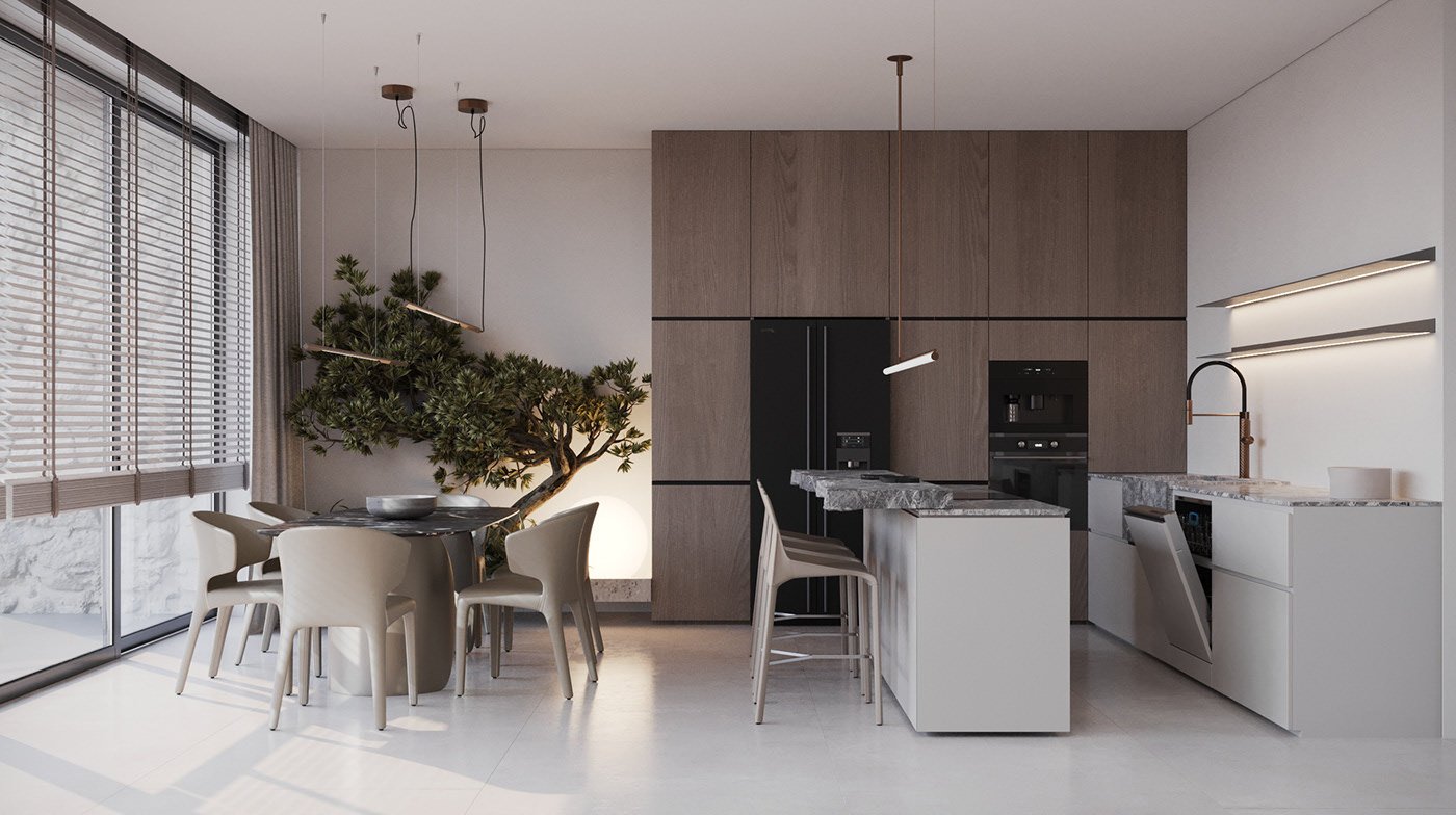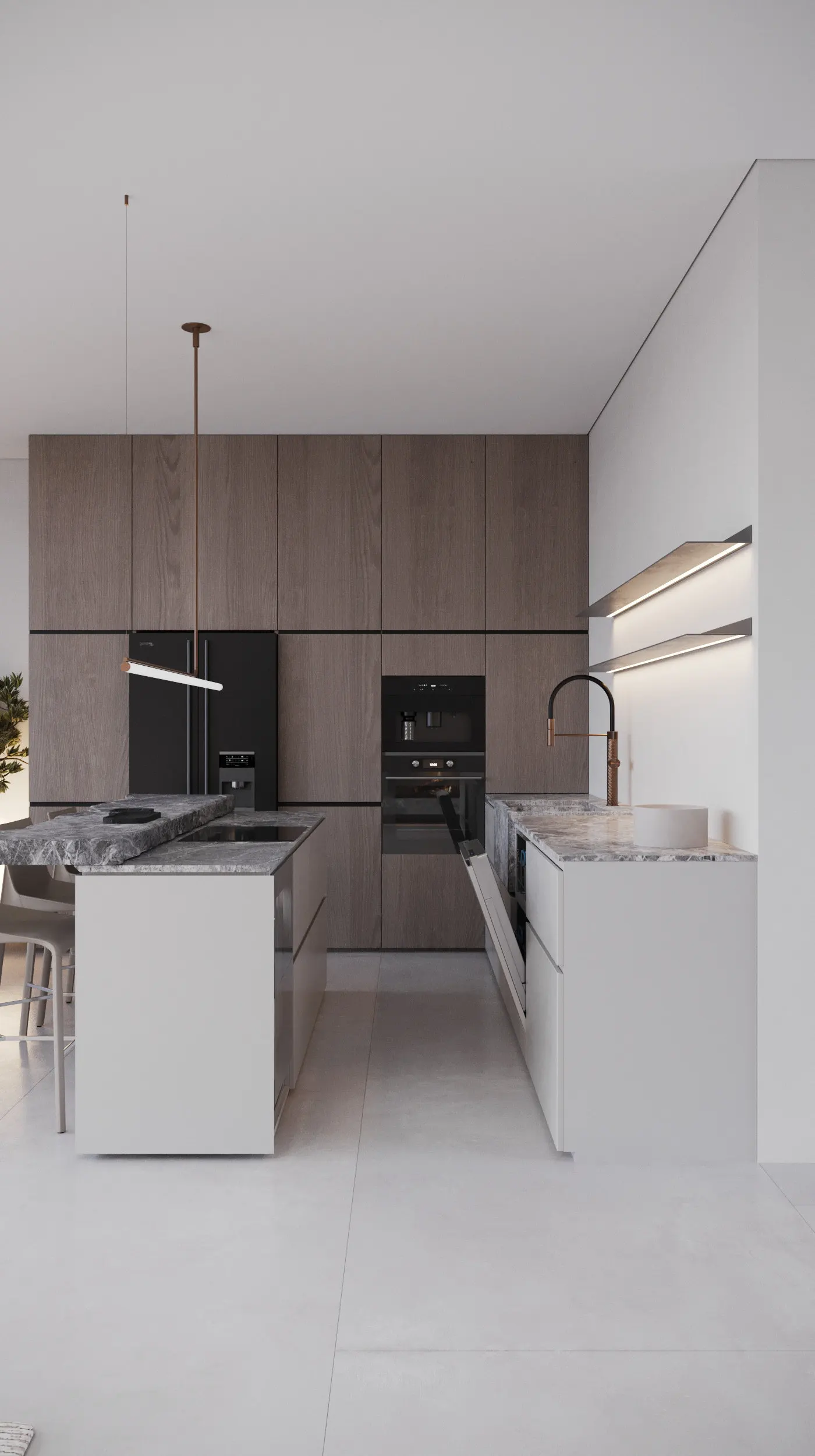 Dark Wood Grain Natural Marble Minimalist Modern Wood Veneer Kitchen Cabinet Villa with 3D Model Online Built-in Refrigerator