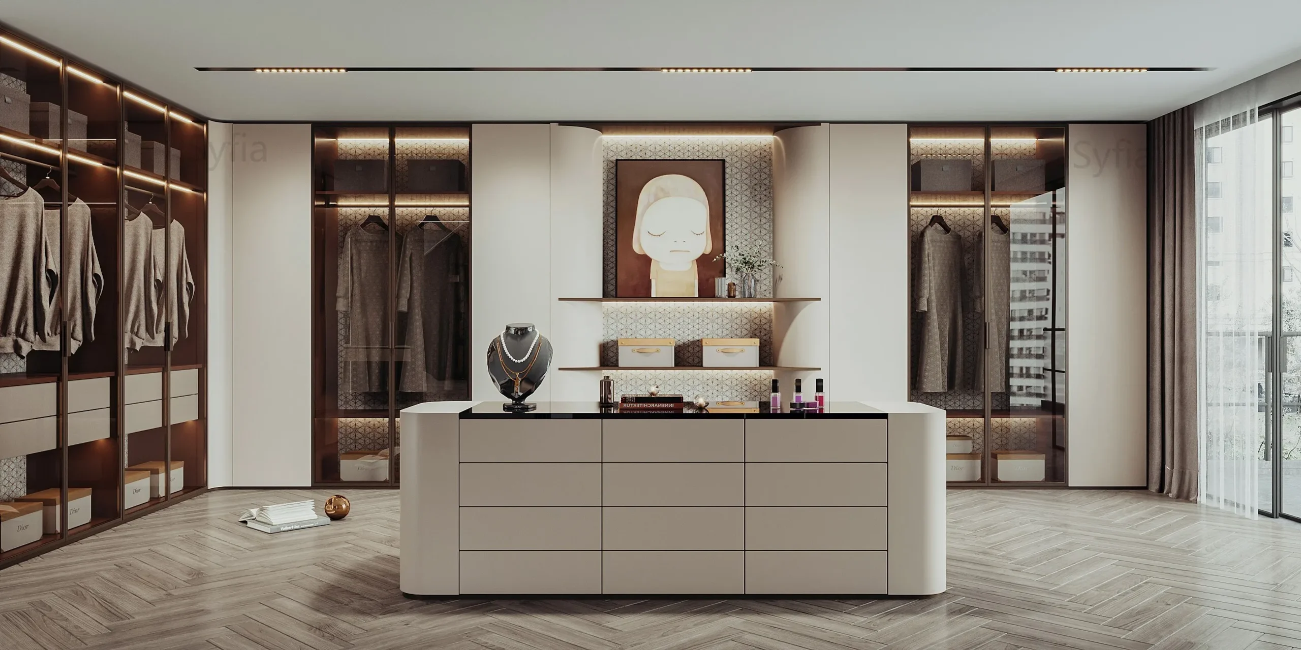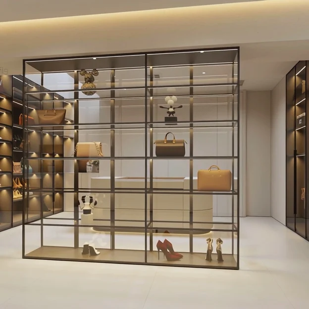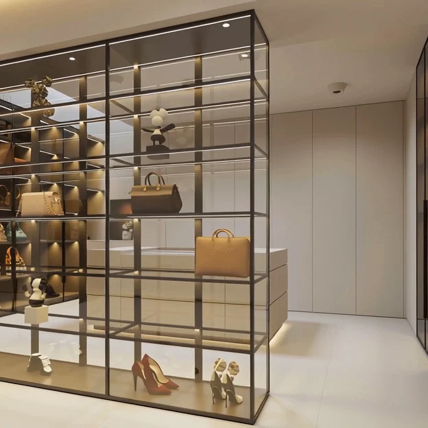 Luxury Minimalist Modern Walk-In Closet Customized Glass Wardrobe Furniture for Villa Apartments 3D Interior Design with Shelves
